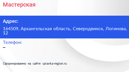 Мастерская по адресу 164509, Архангельская область, Северодвинск, Логинова, 12 в дальнейшем Организация, размещена в следующих категориях: