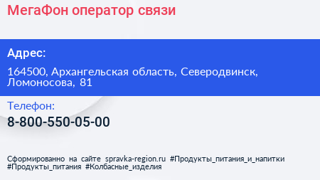 МегаФон, оператор связи по адресу 164500, Архангельская область, Северодвинск, Ломоносова, 81 в дальнейшем Организация, размещена в следующих категориях: