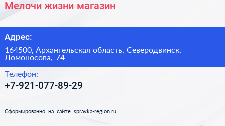 Мелочи жизни, магазин по адресу 164500, Архангельская область, Северодвинск, Ломоносова, 74 в дальнейшем Организация, размещена в следующих категориях: