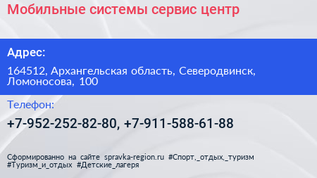 Мобильные системы, сервис-центр по адресу 164512, Архангельская область, Северодвинск, Ломоносова, 100 в дальнейшем Организация, размещена в следующих категориях: