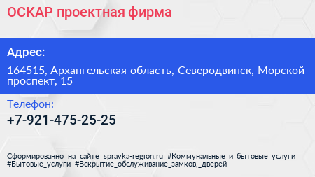 ОСКАР, проектная фирма по адресу 164515, Архангельская область, Северодвинск, Морской проспект, 15 в дальнейшем Организация, размещена в следующих категориях: