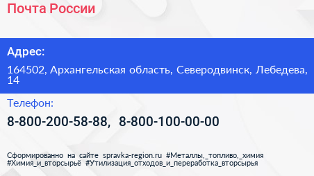 Почта России по адресу 164502, Архангельская область, Северодвинск, Лебедева, 14 в дальнейшем Организация, размещена в следующих категориях: