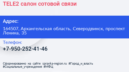 TELE2, салон сотовой связи по адресу 164507, Архангельская область, Северодвинск, проспект Ленина, 35 в дальнейшем Организация, размещена в следующих категориях:
