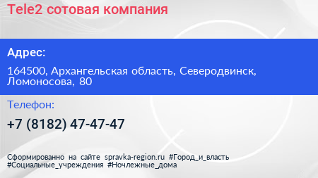 Tele2, сотовая компания по адресу 164500, Архангельская область, Северодвинск, Ломоносова, 80 в дальнейшем Организация, размещена в следующих категориях: