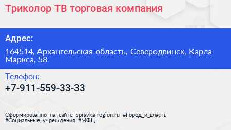 Триколор ТВ, торговая компания по адресу 164514, Архангельская область, Северодвинск, Карла Маркса, 58 в дальнейшем Организация, размещена в следующих категориях: