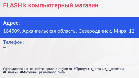 FLASH-k@, компьютерный магазин по адресу 164509, Архангельская область, Северодвинск, Мира, 12 в дальнейшем Организация, размещена в следующих категориях: