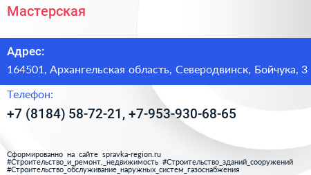 Мастерская по адресу 164501, Архангельская область, Северодвинск, Бойчука, 3 в дальнейшем Организация, размещена в следующих категориях: