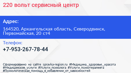 220 вольт, сервисный центр по адресу 164520, Архангельская область, Северодвинск, Первомайская, 20 ст4 в дальнейшем Организация, размещена в следующих категориях: