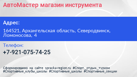 АвтоМастер, магазин инструмента по адресу 164521, Архангельская область, Северодвинск, Ломоносова, 4 в дальнейшем Организация, размещена в следующих категориях: