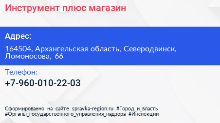 Инструмент плюс, магазин по адресу 164504, Архангельская область, Северодвинск, Ломоносова, 66 в дальнейшем Организация, размещена в следующих категориях: