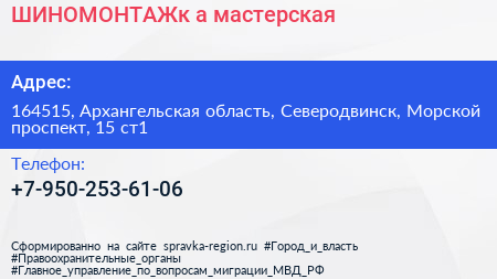 ШИНОМОНТАЖк.а., мастерская по адресу 164515, Архангельская область, Северодвинск, Морской проспект, 15 ст1 в дальнейшем Организация, размещена в следующих категориях: