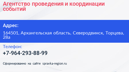 Агентство проведения и координации событий по адресу 164501, Архангельская область, Северодвинск, Торцева, 28а в дальнейшем Организация, размещена в следующих категориях: