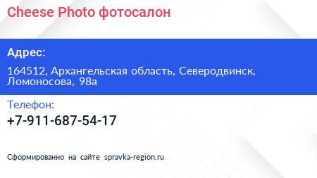 Cheese Photo, фотосалон по адресу 164512, Архангельская область, Северодвинск, Ломоносова, 98а в дальнейшем Организация, размещена в следующих категориях: