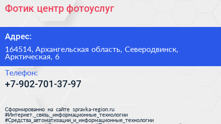 Фотик, центр фотоуслуг по адресу 164514, Архангельская область, Северодвинск, Арктическая, 6 в дальнейшем Организация, размещена в следующих категориях: