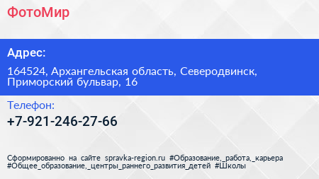 ФотоМир по адресу 164524, Архангельская область, Северодвинск, Приморский бульвар, 16 в дальнейшем Организация, размещена в следующих категориях:
