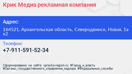 Крик Медиа, рекламная компания по адресу 164521, Архангельская область, Северодвинск, Новая, 1а к2 в дальнейшем Организация, размещена в следующих категориях: