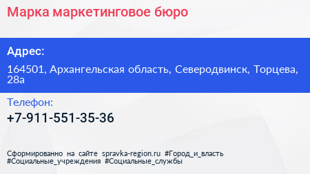 Марка, маркетинговое бюро по адресу 164501, Архангельская область, Северодвинск, Торцева, 28а в дальнейшем Организация, размещена в следующих категориях: