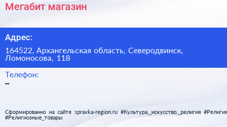 Мегабит, магазин по адресу 164522, Архангельская область, Северодвинск, Ломоносова, 118 в дальнейшем Организация, размещена в следующих категориях: