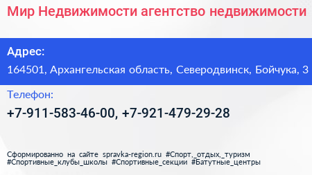 Мир Недвижимости, агентство недвижимости по адресу 164501, Архангельская область, Северодвинск, Бойчука, 3 в дальнейшем Организация, размещена в следующих категориях: