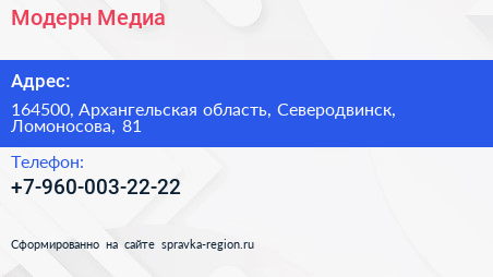 Модерн-Медиа по адресу 164500, Архангельская область, Северодвинск, Ломоносова, 81 в дальнейшем Организация, размещена в следующих категориях: