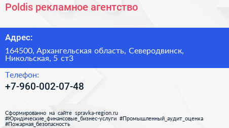 Poldis, рекламное агентство по адресу 164500, Архангельская область, Северодвинск, Никольская, 5 ст3 в дальнейшем Организация, размещена в следующих категориях: