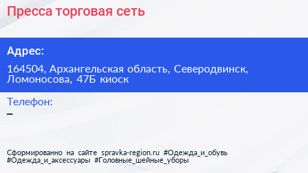 Пресса, торговая сеть по адресу 164504, Архангельская область, Северодвинск, Ломоносова, 47Б киоск в дальнейшем Организация, размещена в следующих категориях: