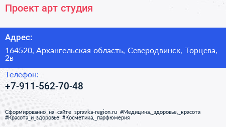 Проект, арт-студия по адресу 164520, Архангельская область, Северодвинск, Торцева, 2в в дальнейшем Организация, размещена в следующих категориях: