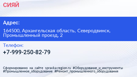 СИЯЙ! по адресу 164500, Архангельская область, Северодвинск, Промышленный проезд, 2 в дальнейшем Организация, размещена в следующих категориях: