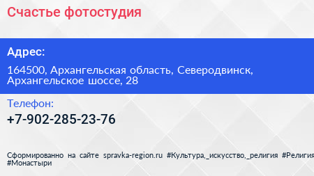 Счастье, фотостудия по адресу 164500, Архангельская область, Северодвинск, Архангельское шоссе, 28 в дальнейшем Организация, размещена в следующих категориях: