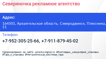 Северяночка, рекламное агентство по адресу 164501, Архангельская область, Северодвинск, Плюснина, 11 в дальнейшем Организация, размещена в следующих категориях: