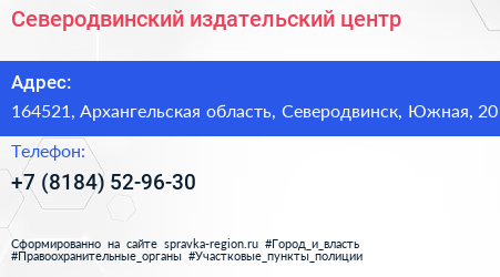 Северодвинский издательский центр по адресу 164521, Архангельская область, Северодвинск, Южная, 20 в дальнейшем Организация, размещена в следующих категориях: