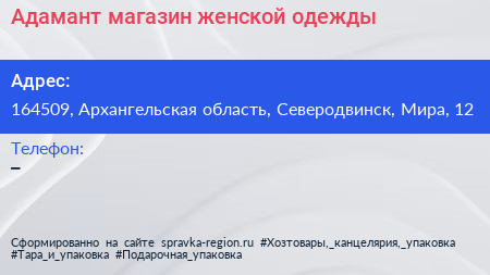 Адамант, магазин женской одежды по адресу 164509, Архангельская область, Северодвинск, Мира, 12 в дальнейшем Организация, размещена в следующих категориях: