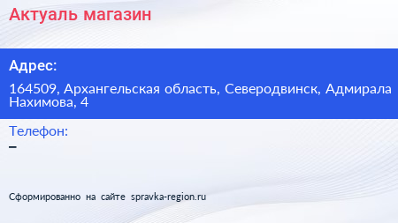 Актуаль, магазин по адресу 164509, Архангельская область, Северодвинск, Адмирала Нахимова, 4 в дальнейшем Организация, размещена в следующих категориях: