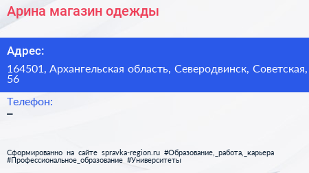Арина, магазин одежды по адресу 164501, Архангельская область, Северодвинск, Советская, 56 в дальнейшем Организация, размещена в следующих категориях: