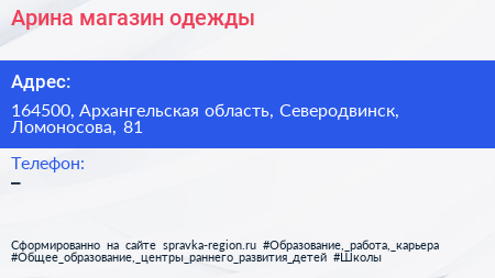 Арина, магазин одежды по адресу 164500, Архангельская область, Северодвинск, Ломоносова, 81 в дальнейшем Организация, размещена в следующих категориях: