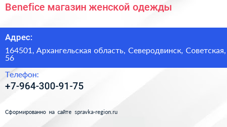 Benefice, магазин женской одежды по адресу 164501, Архангельская область, Северодвинск, Советская, 56 в дальнейшем Организация, размещена в следующих категориях: