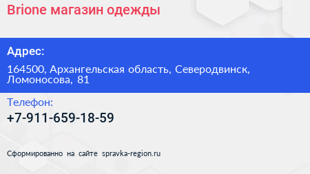 Brione, магазин одежды по адресу 164500, Архангельская область, Северодвинск, Ломоносова, 81 в дальнейшем Организация, размещена в следующих категориях: