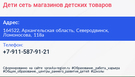 Дети, сеть магазинов детских товаров по адресу 164522, Архангельская область, Северодвинск, Ломоносова, 118а в дальнейшем Организация, размещена в следующих категориях:
