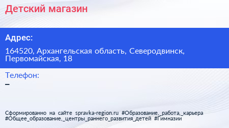 Детский, магазин по адресу 164520, Архангельская область, Северодвинск, Первомайская, 18 в дальнейшем Организация, размещена в следующих категориях: