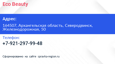Eco Beauty по адресу 164507, Архангельская область, Северодвинск, Железнодорожная, 50 в дальнейшем Организация, размещена в следующих категориях: