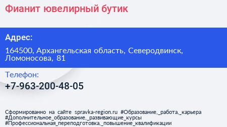 Фианит, ювелирный бутик по адресу 164500, Архангельская область, Северодвинск, Ломоносова, 81 в дальнейшем Организация, размещена в следующих категориях: