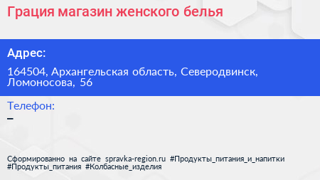 Грация, магазин женского белья по адресу 164504, Архангельская область, Северодвинск, Ломоносова, 56 в дальнейшем Организация, размещена в следующих категориях: