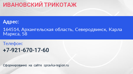 ИВАНОВСКИЙ ТРИКОТАЖ по адресу 164514, Архангельская область, Северодвинск, Карла Маркса, 58 в дальнейшем Организация, размещена в следующих категориях: