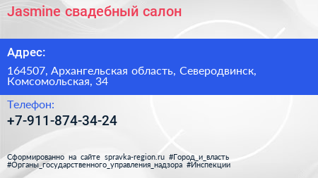 Jasmine, свадебный салон по адресу 164507, Архангельская область, Северодвинск, Комсомольская, 34 в дальнейшем Организация, размещена в следующих категориях: