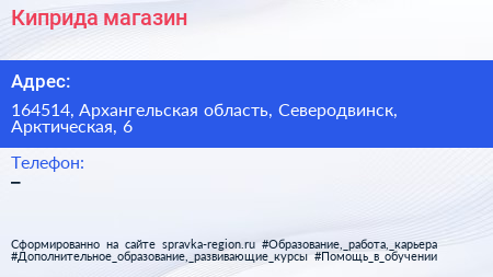 Киприда, магазин по адресу 164514, Архангельская область, Северодвинск, Арктическая, 6 в дальнейшем Организация, размещена в следующих категориях: