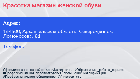 Красотка, магазин женской обуви по адресу 164500, Архангельская область, Северодвинск, Ломоносова, 81 в дальнейшем Организация, размещена в следующих категориях: