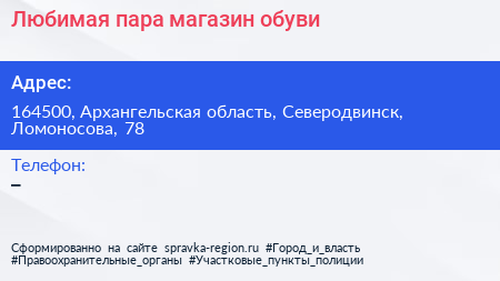Любимая пара, магазин обуви по адресу 164500, Архангельская область, Северодвинск, Ломоносова, 78 в дальнейшем Организация, размещена в следующих категориях: