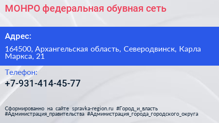 МОНРО, федеральная обувная сеть по адресу 164500, Архангельская область, Северодвинск, Карла Маркса, 21 в дальнейшем Организация, размещена в следующих категориях: