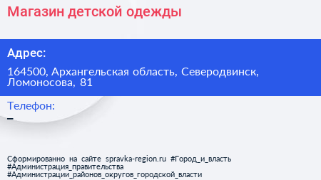 Магазин детской одежды по адресу 164500, Архангельская область, Северодвинск, Ломоносова, 81 в дальнейшем Организация, размещена в следующих категориях: