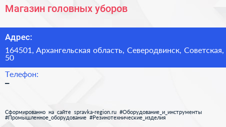 Магазин головных уборов по адресу 164501, Архангельская область, Северодвинск, Советская, 50 в дальнейшем Организация, размещена в следующих категориях: